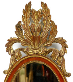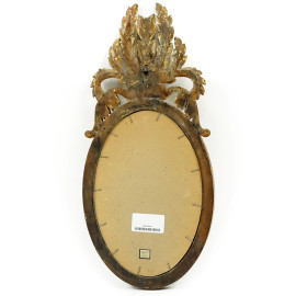 Specchiera di linea ovale in legno scolpito e dorato, cimasa a motivi fogliacei, XX secolo, cm 50,5x23,5