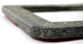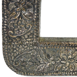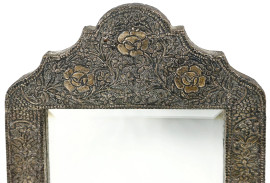 Specchiera di linea sagomata rivestita in lamina d'argento, sbalzata e incisa a motivi floreali, inizi XX secolo, cm 45x30, (piccoli difetti)