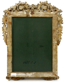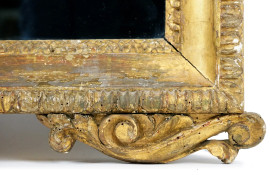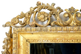 Specchiera in legno intagliato e dorato, XIX secolo, di linea rettangolare con cimasa scolpita a volute e fiori, festoni ricadenti ai lati, misure ingombro cm 86x66, luce cm 58x43, (difetti)