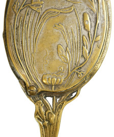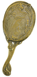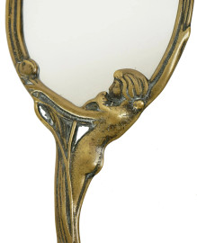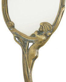 Specchio a mano Liberty, in metallo argentato, presa a forma di donna, decori a motivi floreali, cm 25x10,5, (difetti)