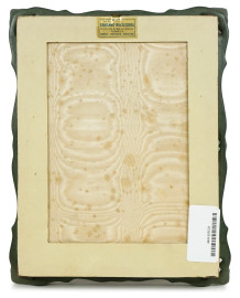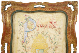 Stemma papale "Piux X Pontifex Maximus", tessuto ricamato a vari fili colorati e dorati, cm 20,5x14,5, inizi XX secolo, entro cornice, (lievi difetti).
