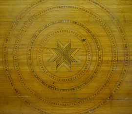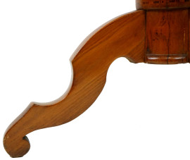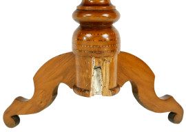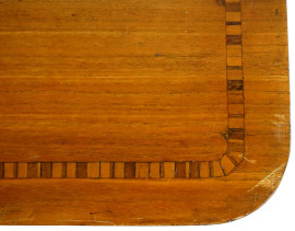 Tavolino di linea rettangolare in noce con intarsi e filetti in vari legni pregiati, poggiante su montante a colonna e tre piedi, XIX secolo, cm h 75x79x53, (difetti e restauri).
