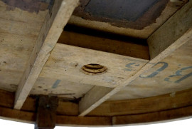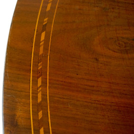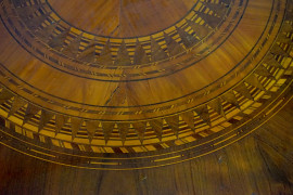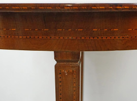 Tavolo intarsiato in varie essenze, XIX secolo, piano circolare decorato da intarsi geometrici, poggiante su quattro gambe ad obelisco rovesciato (postume), diametro cm 90, altezza cm 76