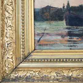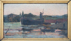 Tramonto sul Tevere, olio su tavola, cm 9,5x17, firmato, entro cornice.
