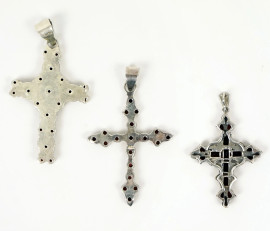 Tre ciondoli in argento 925 e granati a forma di croce, Messico, XX secolo, misure max cm 8,5x4,5