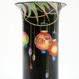 Vaso in porcellana Crown Ducal England, anni '20, a fondo nero con decoro policromo raffigurante lanterne cinesi, cm h 27,5