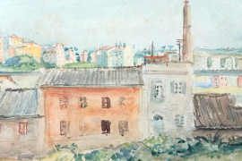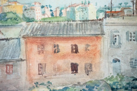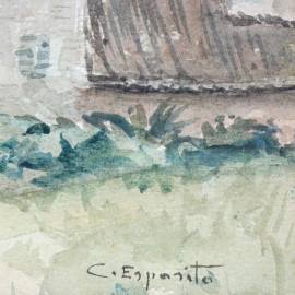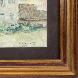 Veduta di paese, acquarello su carta, cm 28x34, firmato, entro cornice.