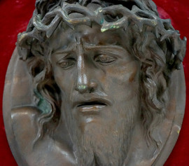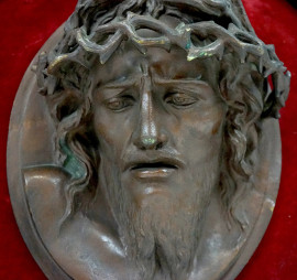 Volto di Cristo, placca in bronzo a bassorilievo, cm h 26x24, XX secolo, entro cornice con supporto in velluto, (difetti).