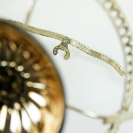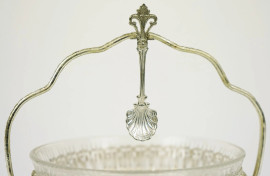 Zuccheriera in metallo argentato e traforato con vaschetta in vetro e cucchiaino di accompagno, cm h 15, XX secolo, (segni del tempo).