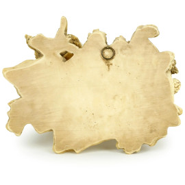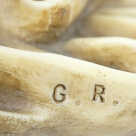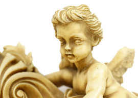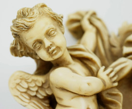 Acquasantiera in resina con vasca sostenuta da coppia di cherubini alati, cm h 19x23, siglata G.R.