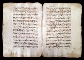 Antica rara doppia pagina manoscritta in caratteri arabi vergati a inchiostro bruno e lacca rossa, Persia, XVI sec., (difetti e macchie).
