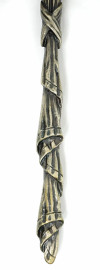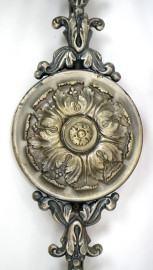 Applique a 8 luci in metallo argentato, bracci a volute, fusto decorato con rosoni, foglie e nastri, XX secolo, cm h 113, (difetto)