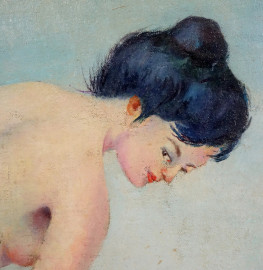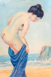 Bagnante, olio su tela riportata su tavola, cm 47x36, firmato, entro cornice.