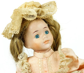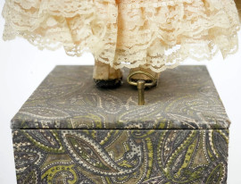 Bambola da collezione con carillon, veste e cappellino in stoffa e merletti, ingombro tot cm 47x15,5x15,5, inizi XX secolo, (difetti, carillon funzionante).