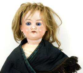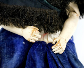 Bambola in legno intagliato e dorato con vestiti in tessuti diversi, cm h 47, inizi XX secolo, (difetti).