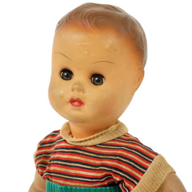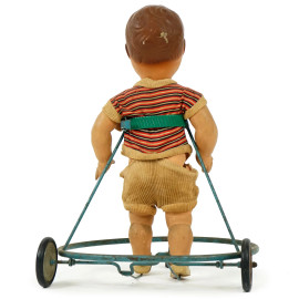 Bambolotto anni '60 con girello su rotelle, cm 44x36, (difetti).