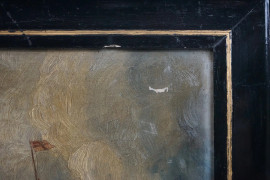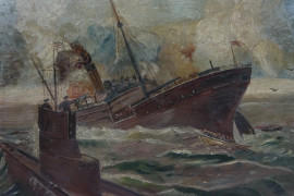 Battaglia navale, olio su cartone, cm 32x50, XX secolo, entro cornice, (difetti)
