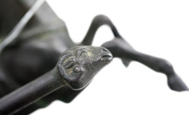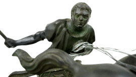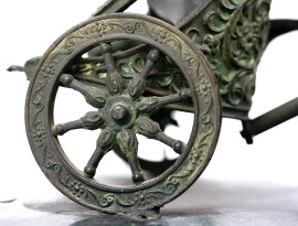 Biga romana, scultura in metallo brunito, cm h 20, poggiante su base in marmo, inizi XX secolo.