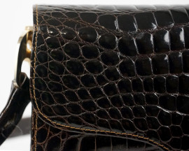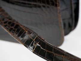 Borsa in pelle di coccodrillo color marrone, chiusura in metallo dorato, cm h 18x24x10, manico cm h 46 circa, (difetti)