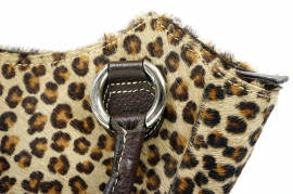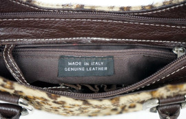 Borsetta a mano animalier, in pelle color marrone e pelo leopardato, doppio manico, finiture in metallo argentato, cm h 30x30x9, Made in Italy, (segni di utilizzo).