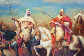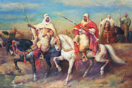 Cavalieri arabi, olio su tavola, cm 30x40, XX secolo, entro cornice.