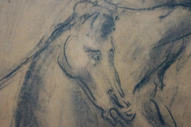 Cavalli, carboncino su carta, cm 41x34,5 circa, firma poco leggibile in basso a destra, entro cornice, (difetti sulla carta).