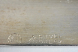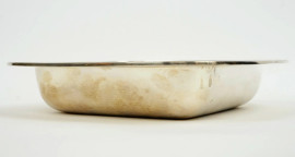Centrotavola in metallo argentato di linea quadrangolare, cm h 6x28,5x29, XX secolo.