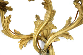 Coppia di appliques a tre luci in metallo dorato, bracci a volute, XX secolo, cm h 48x36, (lievi difetti).