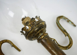 Coppia di appliques in metallo dorato con paralumi in vetro, cm h 48, inizi XX secolo, (segni del tempo)