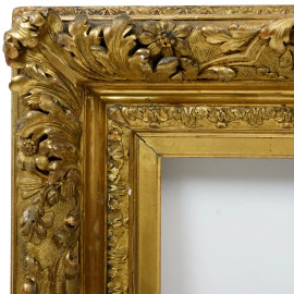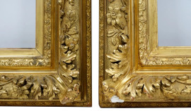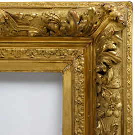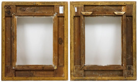Coppia di cornici in legno intagliato e dorato, XX secolo, misure ingombro cm 66x57, misure luce cm 42,5x32,5, (difetti).