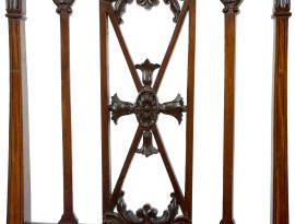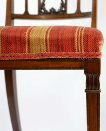 Coppia di seggiole in mogano, XIX secolo, cartelle intagliate, traforate e filettate, sedute rivestite in tappezzeria bordeaux a righe, gambe a sciabola, cm h 87, (lievi difetti).