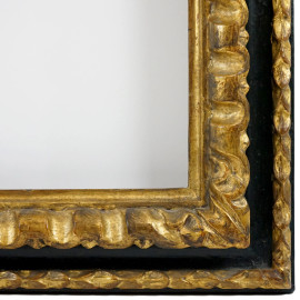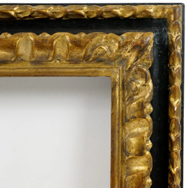 Cornice in legno intagliato, dorato ed ebanizzato, XX secolo, misure ingombro cm 56x76, misure luce cm 40,5x60, (difetti).