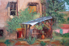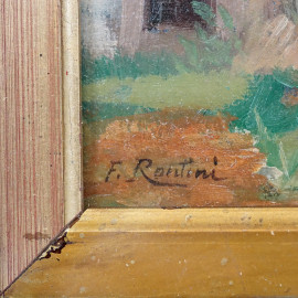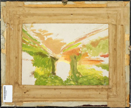 Esterno di fattoria, dipinto double face ad olio su cartone, cm 23x32, firmato, entro cornice.
