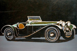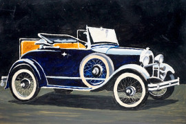 Ford e Jaguar, due dipinti ad olio su compensato, cm 24x32, inizi XX secolo, (lievi difetti).