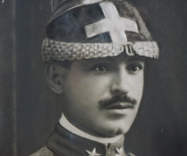 Fotografia d'epoca raffigurante ufficiale con elmo del Reggimento Savoia, cm 38x27 circa, entro cornice, (segni del tempo).