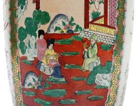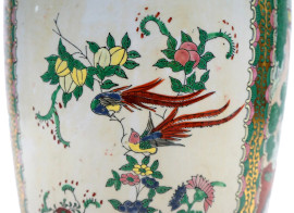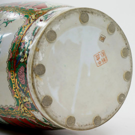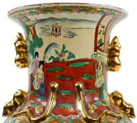Grande vaso in porcellana con decori policromi, riserve con volatili e scene di corte, prese laterali e particolari dorati, cm h 62, Cina, XX secolo.