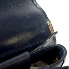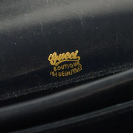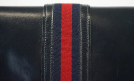 Gucci, clutch vintage in pelle color blu, dettaglio centrale a banda color blu e rosso, chiusura in metallo dorato a forma di logo, cm h 19,5x26,5x4, (segni di utilizzo)