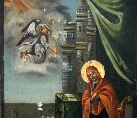Icona raffigurante l'Annunciazione, olio su tavola, cm 26,5x20,5, XX secolo, (difetti).