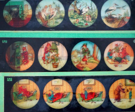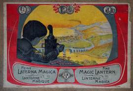 La lanterna magica, strumento di proiezione d'immagini completo di dodici diapositive a colori, cm h 20,5x19x14, entro scatola originale, (difetti).