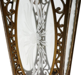 Lanterna in vetro con decori floreali e gabbia in metallo dorato, cm h 66, metà XX secolo, (difetti).