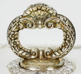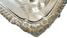 Legumiera con coperchio in metallo argentato, cm 17x23x17, XX secolo.