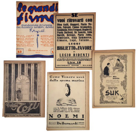 Lotto composto da cinque locandine, inizi XX secolo, stampa fronte e retro di pubblicità d’epoca, cm 24x18 cadauna