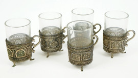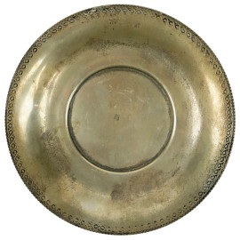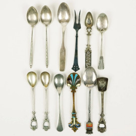 Lotto composto da due cucchiaini in metallo argentato, tre piattini, una forchettina e cinque sottobicchieri traforati con piedini in argento, peso argento gr.480 circa.