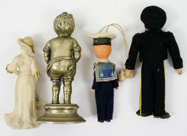 Lotto composto da due piccole bambole e due sculture in materiali diversi, alt.max cm 18,5, XX secolo, (difetti e mancanze).