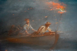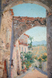 Lotto composto da un pastello ed un olio su cartone telato raffiguranti personaggi in barca e scorcio di borgo, misure max cm 33x47,5, uno firmato, (difetti sulla carta).