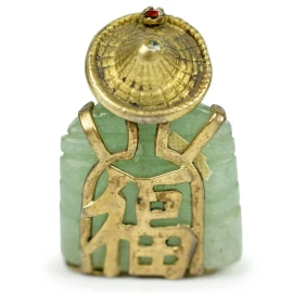 Lotto composto da una placchetta ed un ciondolo in giadeite a forma di Buddha con montatura in oro 14 kt, misure max cm 4,7x3x1