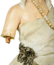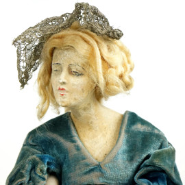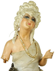Lotto di due bambole raffiguranti dame con ampi abiti d'epoca in raso e velluto, particolari ricamati e merlettati, alt. max cm 52, XX secolo, (difetti, mancante un braccio).