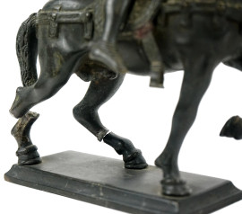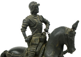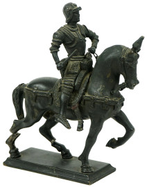 Lotto di due piccole sculture in bronzo e metallo raffiguranti monumento equestre a Bartolomeo Colleoni e crociato, alt. max cm 27, XX secolo, (difetti e mancanze).