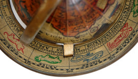Lotto di tre mappamondi, di cui due poggianti su basi in legno, ingombro max cm 43x34, epoche diverse, (difetti, un supporto mancante).