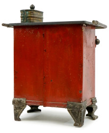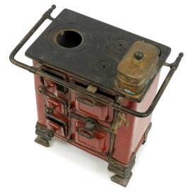 Modellino di cucinetta vintage in ferro smaltato rosso e rame, cm h 40x40x25, (difetti).